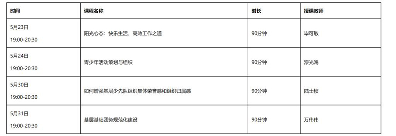 该培训班以提高宕昌县共青团干部的履职能力为目标,为推进宕昌县共青团人才队伍建设提供助力。培训共计4次课程,特邀中国社会科学院大学少年儿童研究中心研究员漆光鸿,原中粮集团高管毕可敏,中国社会科学院社会学所陆士桢教授,中央团校(中国青年政治学院)党委组织部副部长万伟伟联袂授课。课程涵盖青少年活动策划与执行、团务规范化建设等针对性核心课程,以及如何调整心态、如何增强集体荣誉感和归属感等软技能的提升。